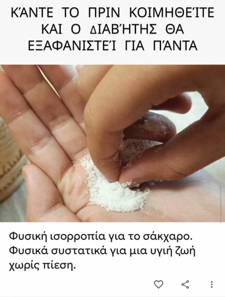 Άλλο μήνυμα που επίσης κυκλοφορεί τους τελευταίους μήνες καλεί τους ασθενείς να χρησιμοποιήσουν χαπάκια: «Πήρα δύο χάπια και ξέχασα τον διαβήτη για 10 χρόνια. Τα πουλάνε παντού…» ενώ τρίτο μήνυμα υπόσχεται να εξαφανίσει τον διαβήτη: «Κάντε το πριν κοιμηθείτε και ο διαβήτης θα εξαφανιστεί για πάντα».