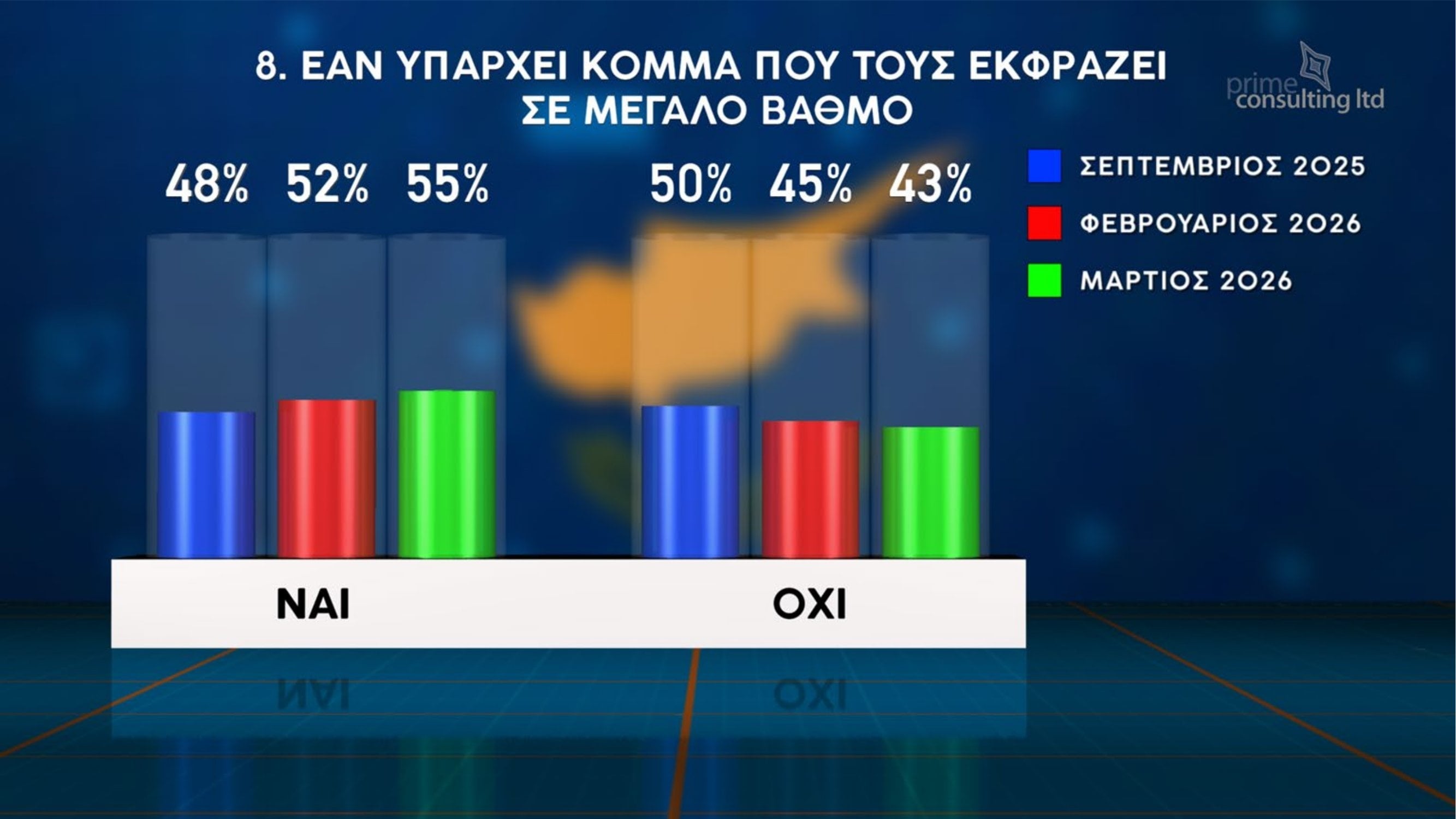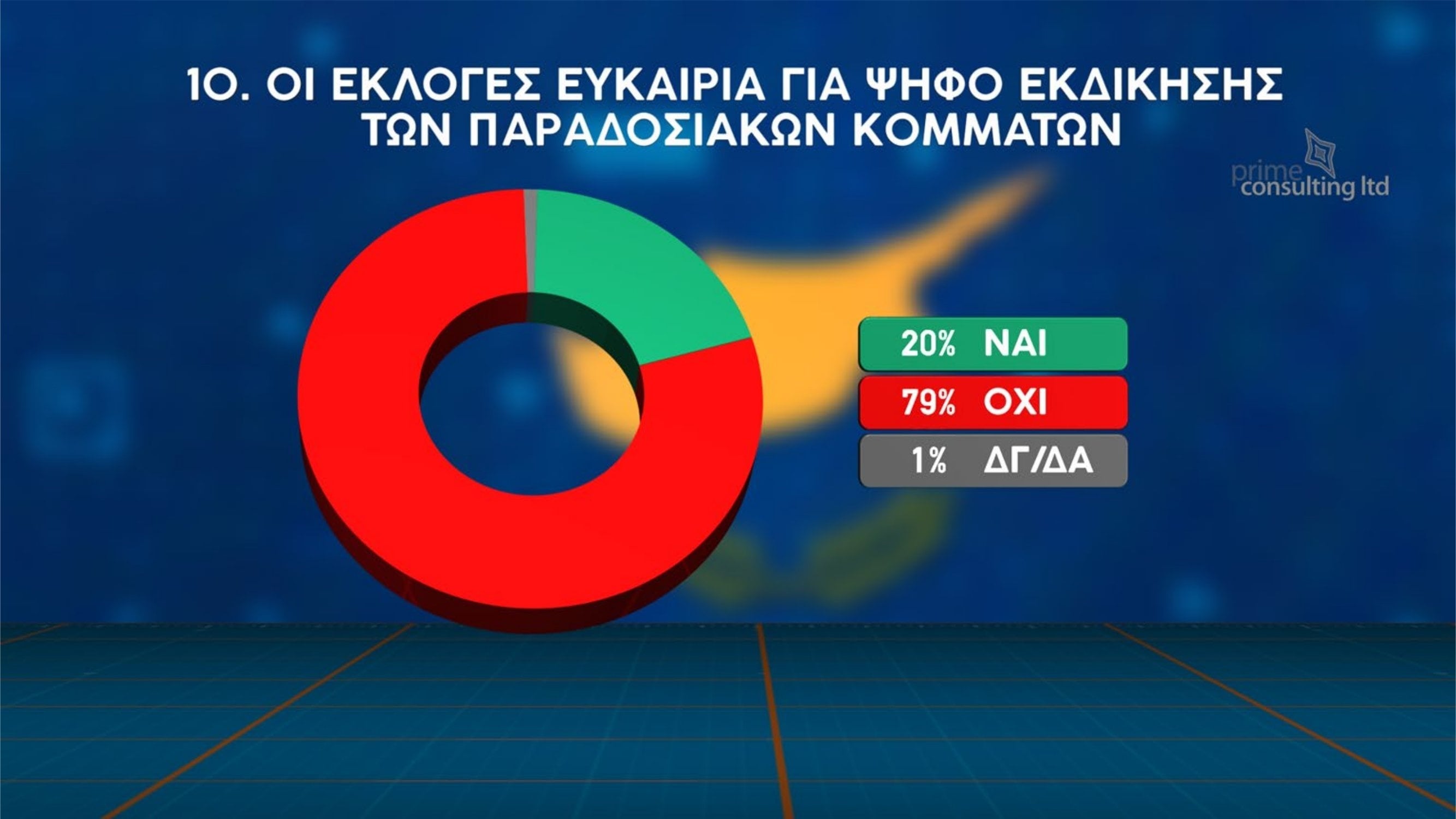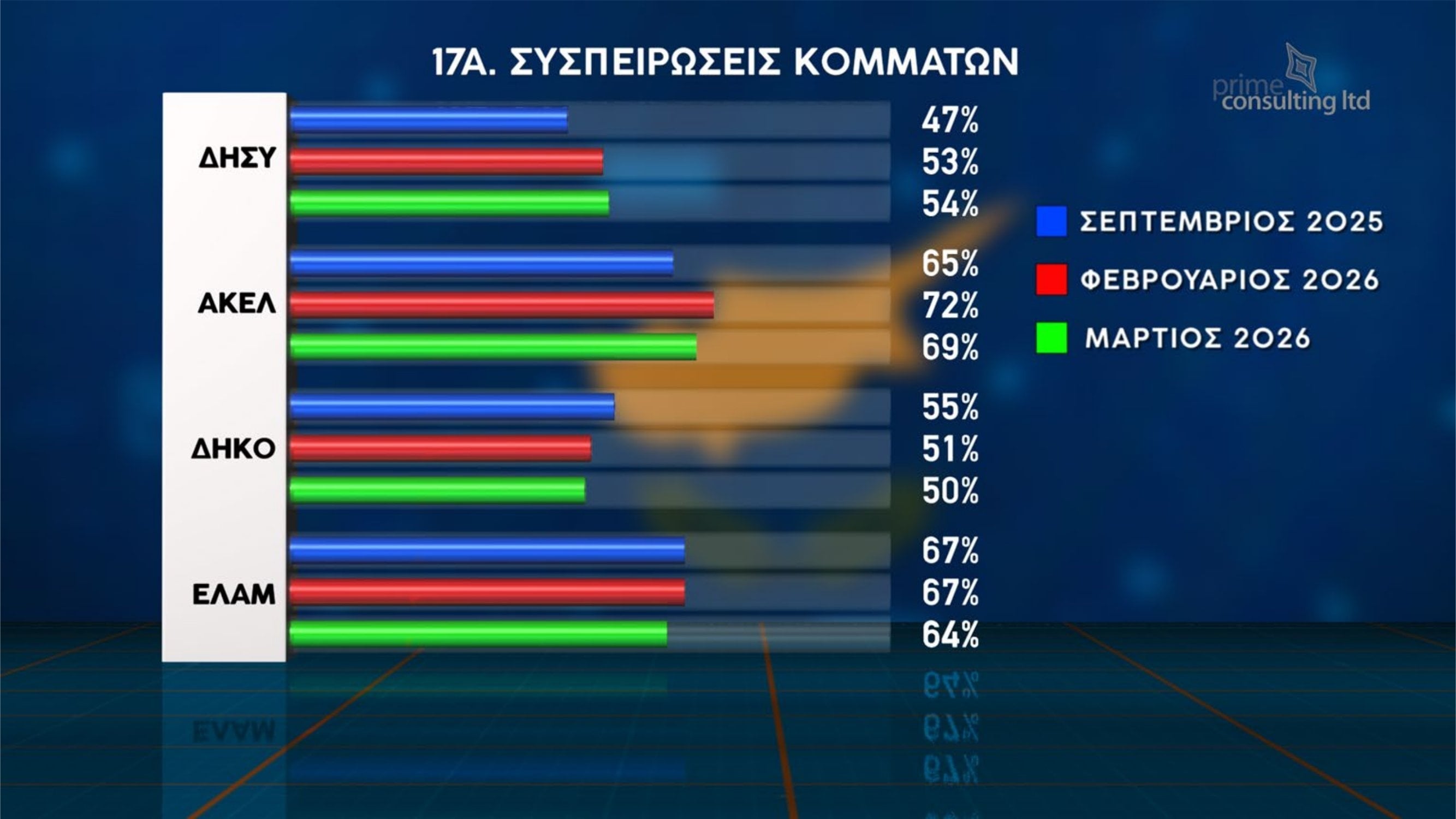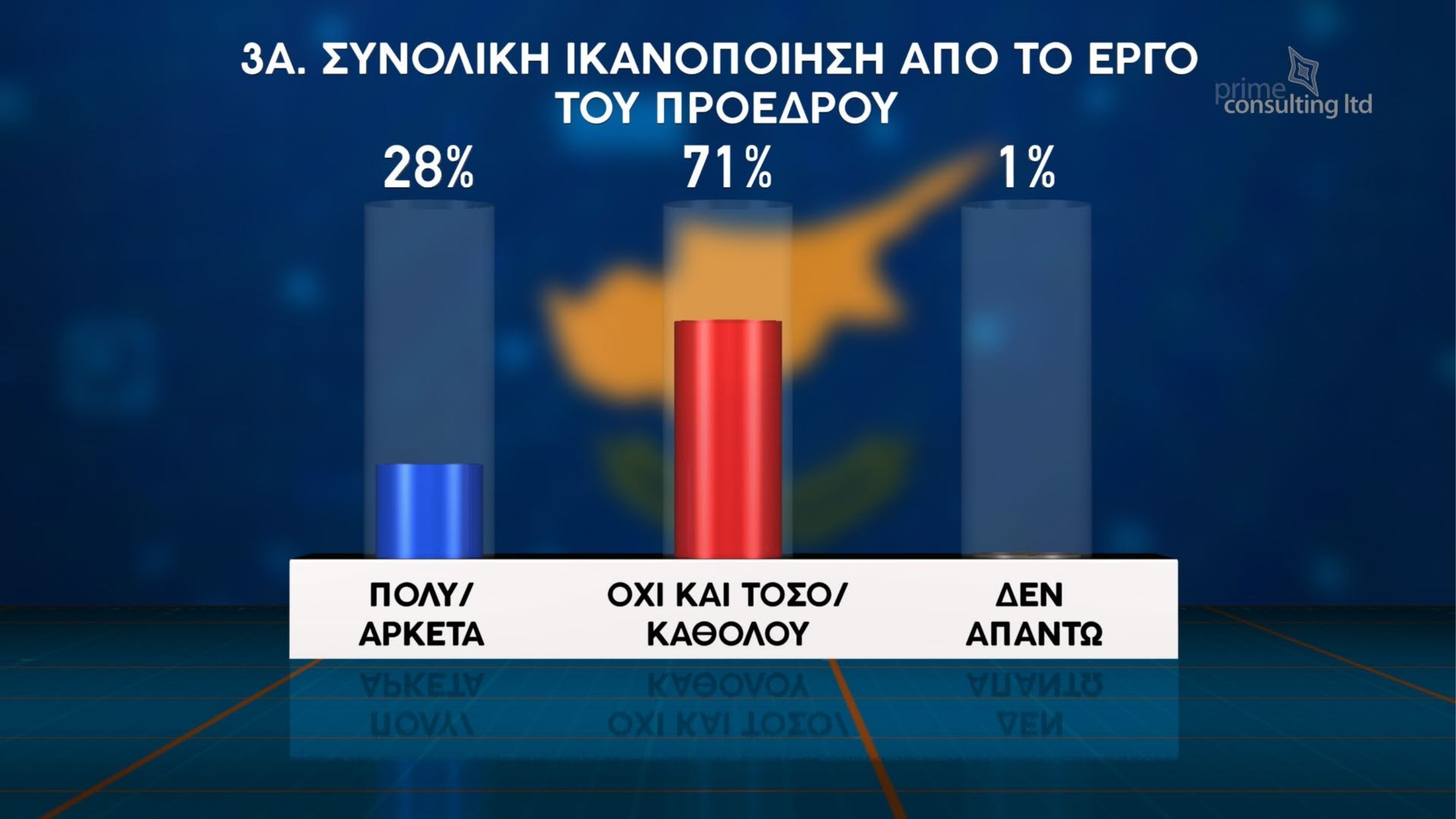 Έντονη δυσαρέσκεια των πολιτών για την πολιτική κατάσταση, αλλά και διάθεση για αλλαγές στο κομματικό σκηνικό, καταγράφει η νέα δημοσκόπηση που παρουσιάστηκε στην εκπομπή «Χωρίς Περιστροφές» στην τηλεόραση του Σίγμα. Η έρευνα πραγματοποιήθηκε παγκύπρια από την εταιρεία Prime Consulting, με δείγμα 1003 ατόμων και περιθώριο στατιστικού σφάλματος ±3%.