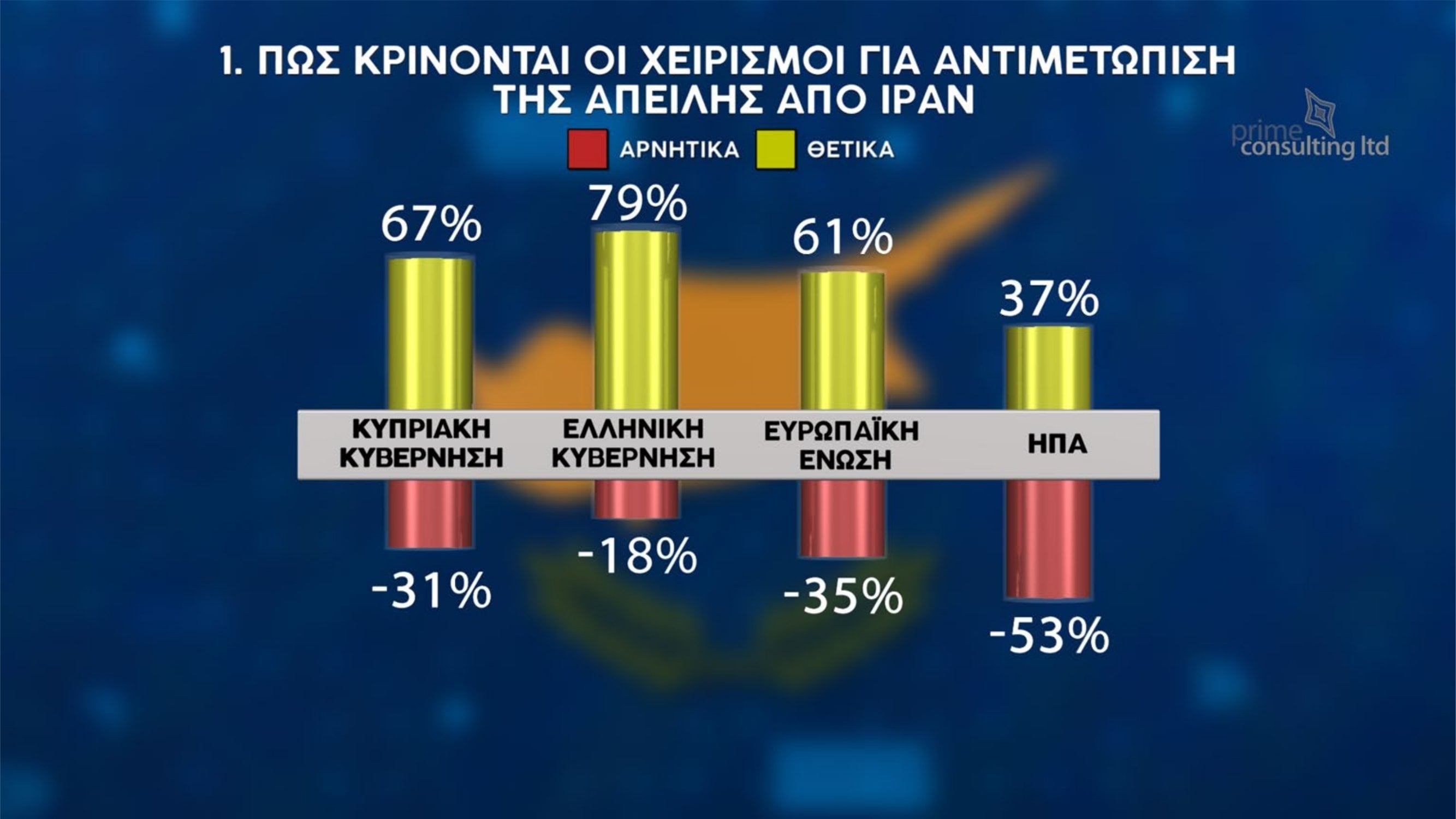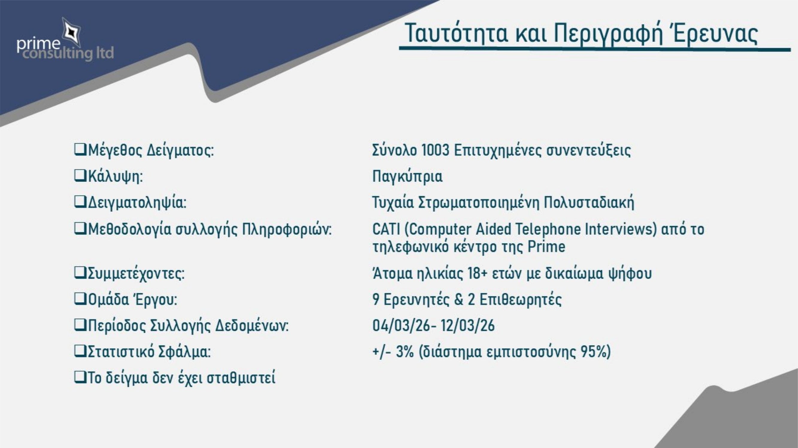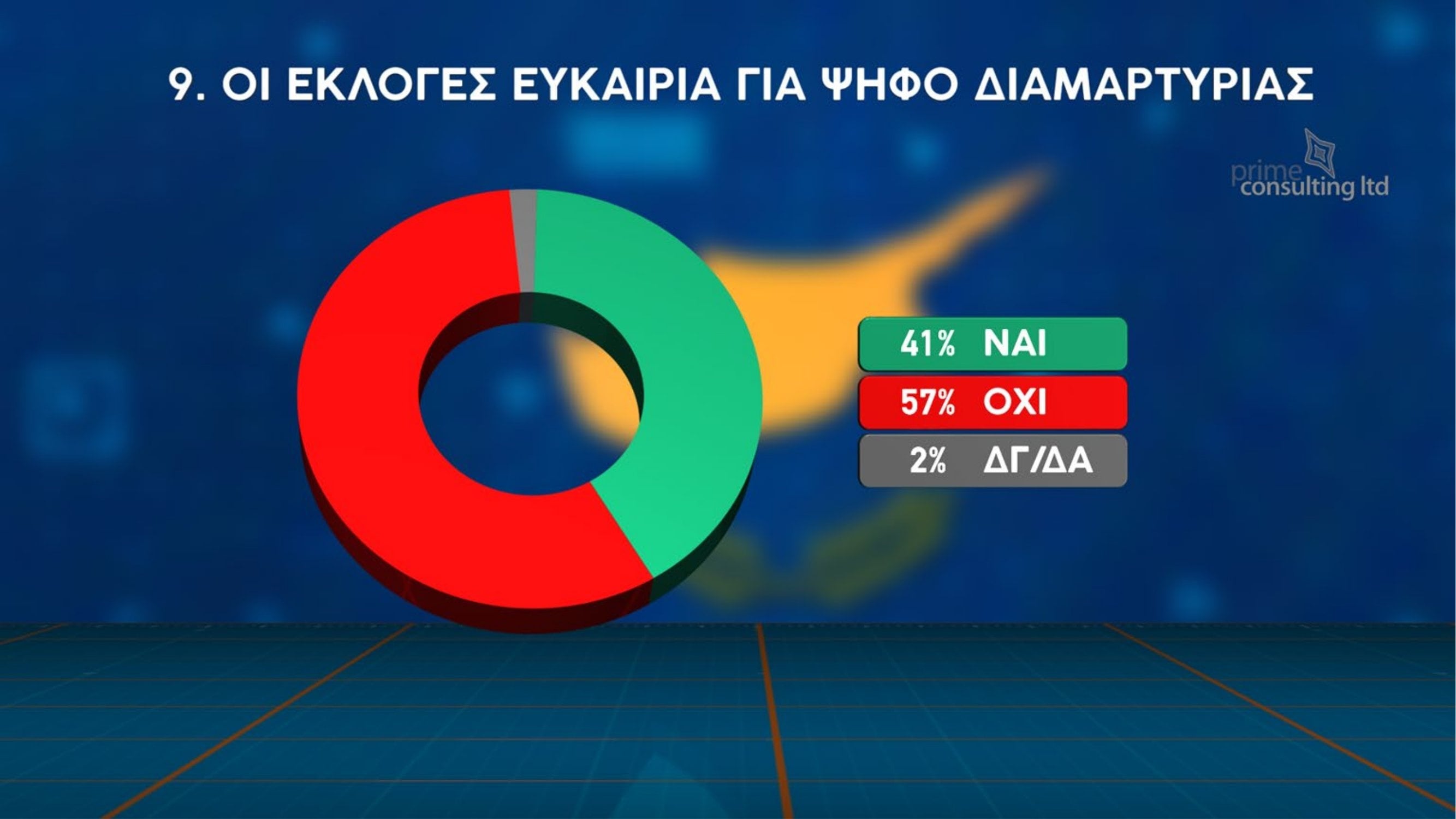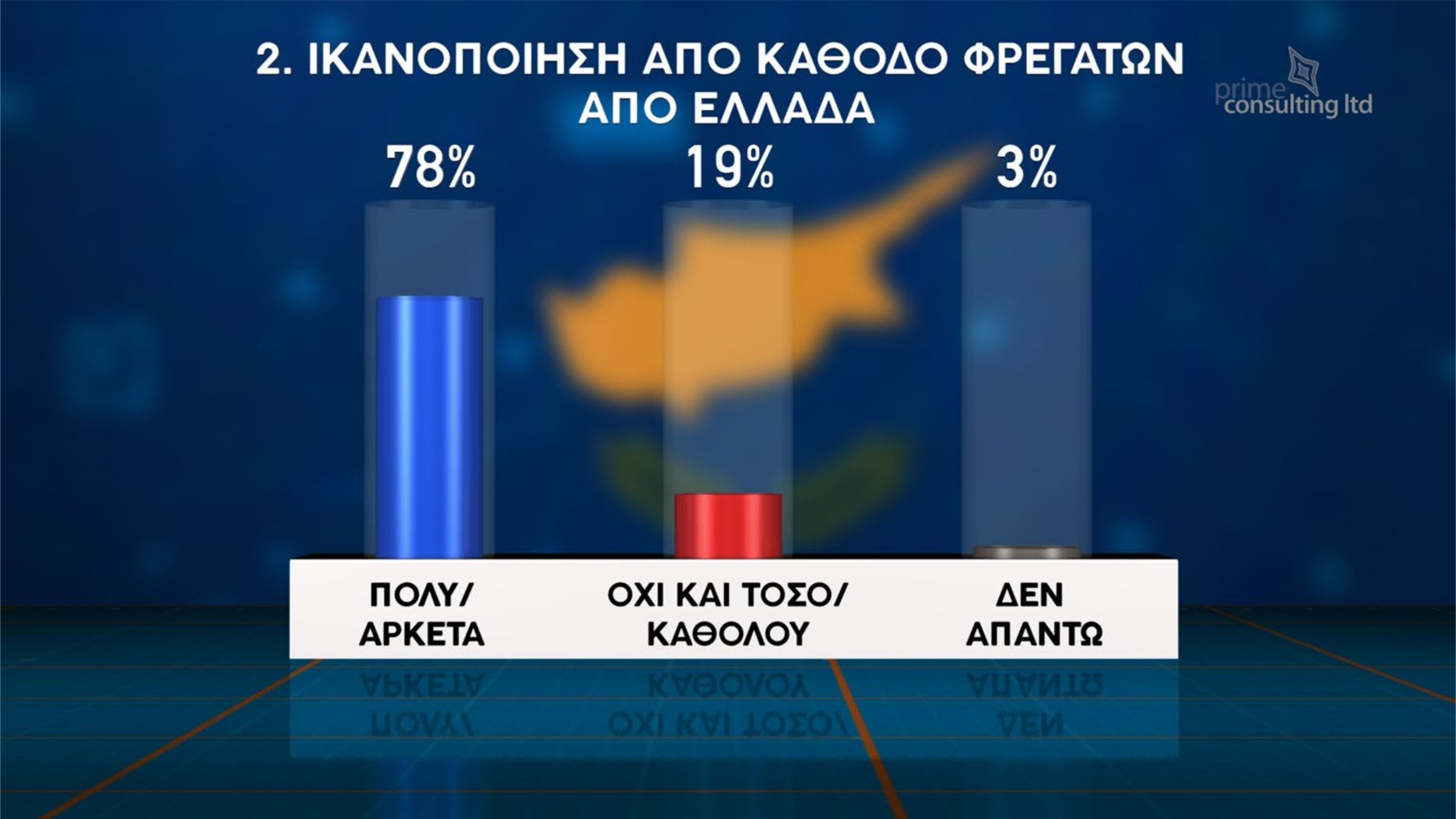 Έντονη δυσαρέσκεια των πολιτών για την πολιτική κατάσταση, αλλά και διάθεση για αλλαγές στο κομματικό σκηνικό, καταγράφει η νέα δημοσκόπηση που παρουσιάστηκε στην εκπομπή «Χωρίς Περιστροφές» στην τηλεόραση του Σίγμα. Η έρευνα πραγματοποιήθηκε παγκύπρια από την εταιρεία Prime Consulting, με δείγμα 1003 ατόμων και περιθώριο στατιστικού σφάλματος ±3%.