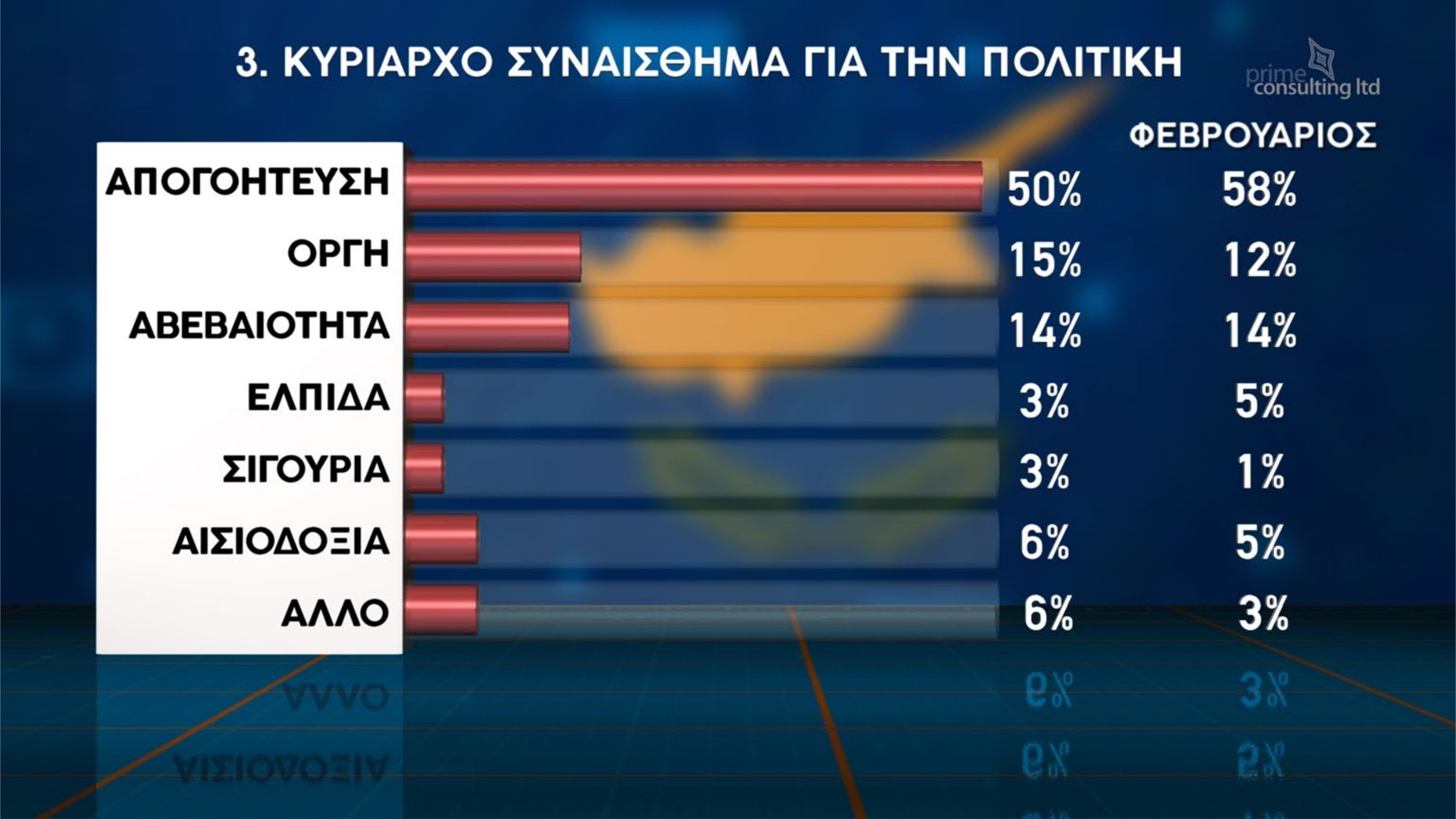 Σύμφωνα με τα ευρήματα, κυρίαρχο συναίσθημα των πολιτών απέναντι στην πολιτική είναι η απογοήτευση, την οποία δηλώνει το 50% των ερωτηθέντων, ποσοστό χαμηλότερο σε σχέση με το 58% που καταγραφόταν τον Φεβρουάριο. Ακολουθούν η οργή με 15% και η αβεβαιότητα με 14%, ενώ πολύ χαμηλότερα βρίσκονται συναισθήματα όπως η αισιοδοξία (6%), η ελπίδα (3%) και η σιγουριά (3%).