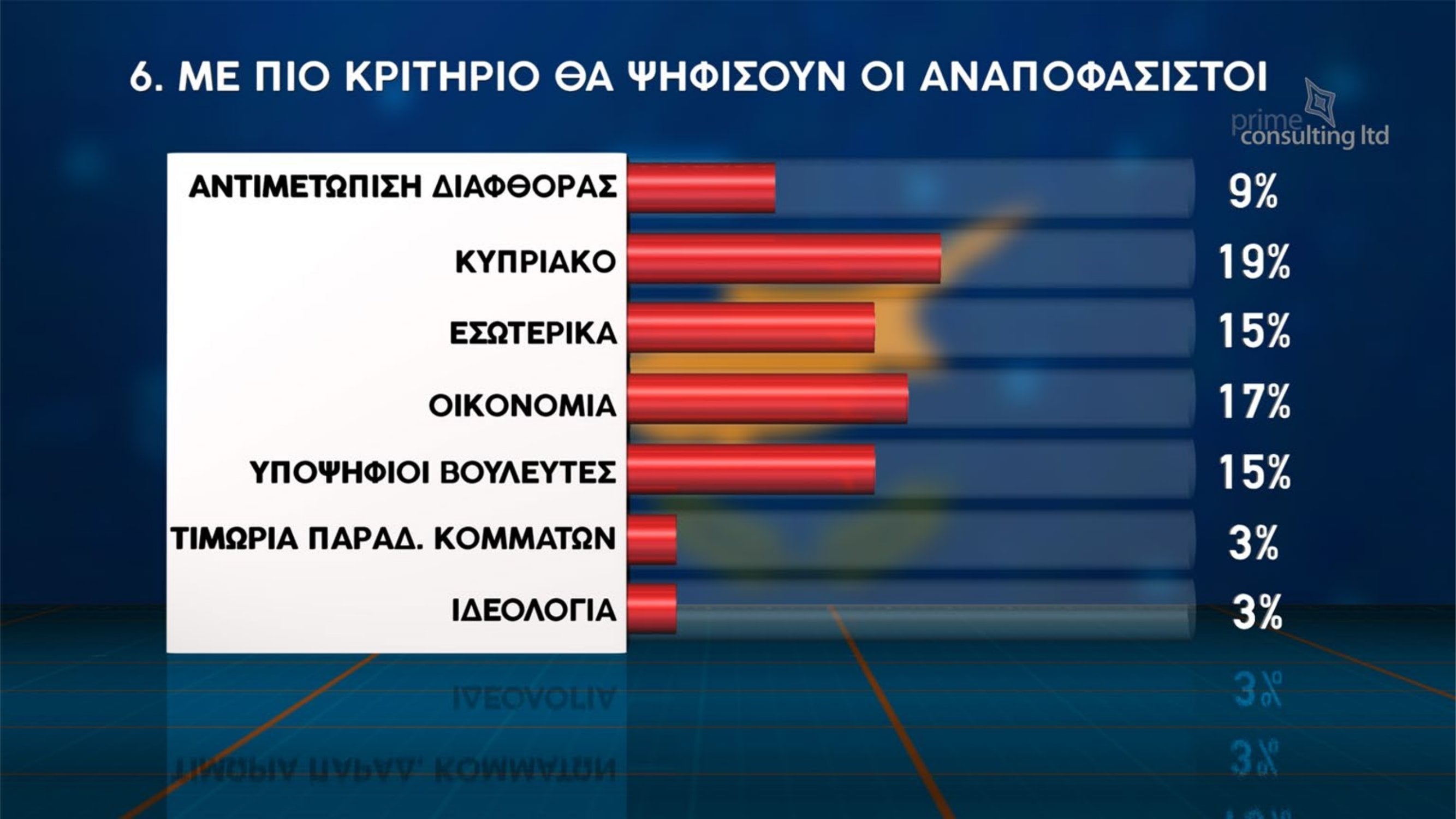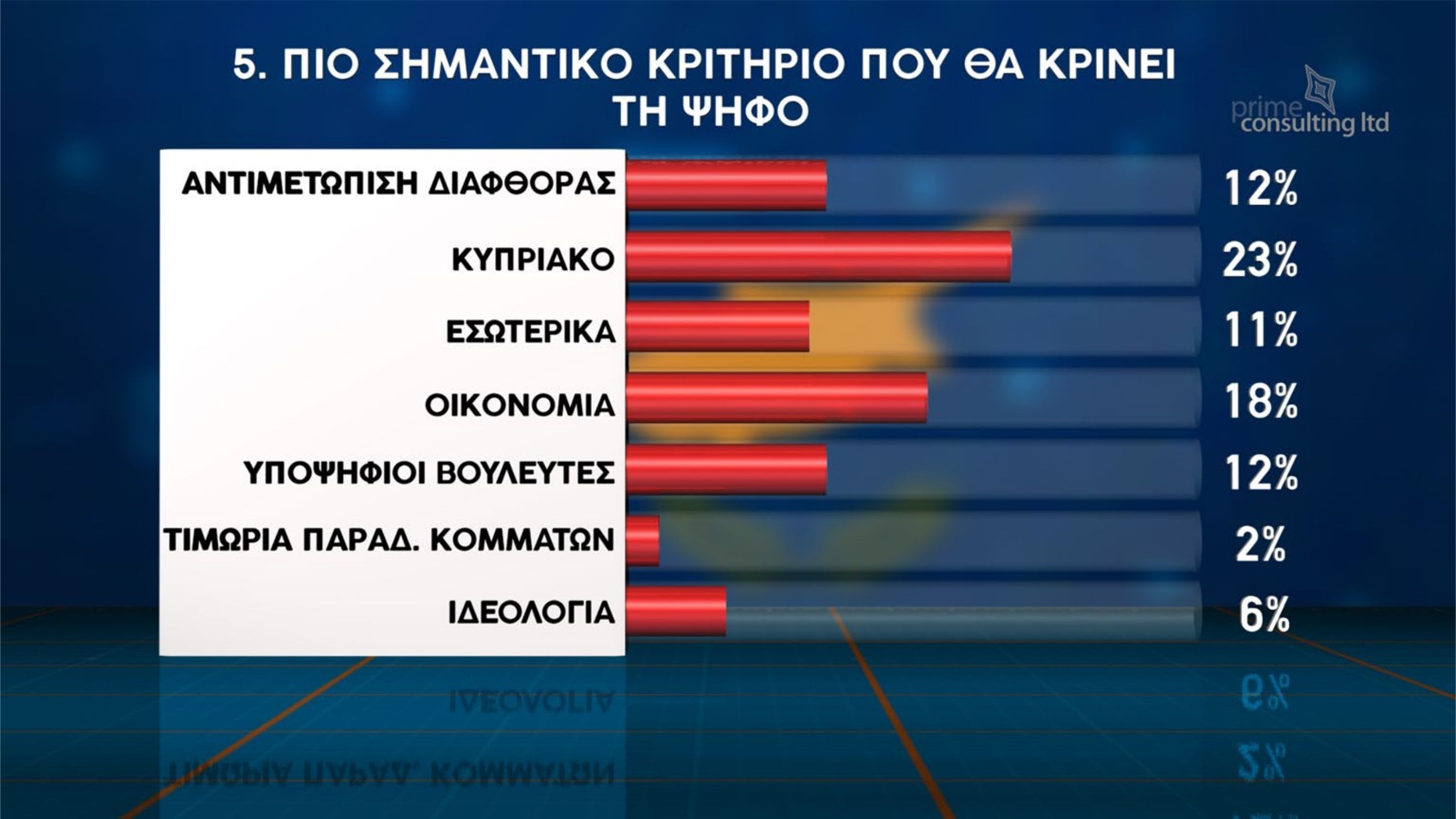 Όσον αφορά τα ζητήματα που θα καθορίσουν την ψήφο των πολιτών στις επόμενες βουλευτικές εκλογές, το Κυπριακό αναδεικνύεται ως το σημαντικότερο κριτήριο με ποσοστό 23%, ακολουθούμενο από την οικονομία με 18%, την αντιμετώπιση της διαφθοράς με 12% και τα εσωτερικά ζητήματα με 11%.