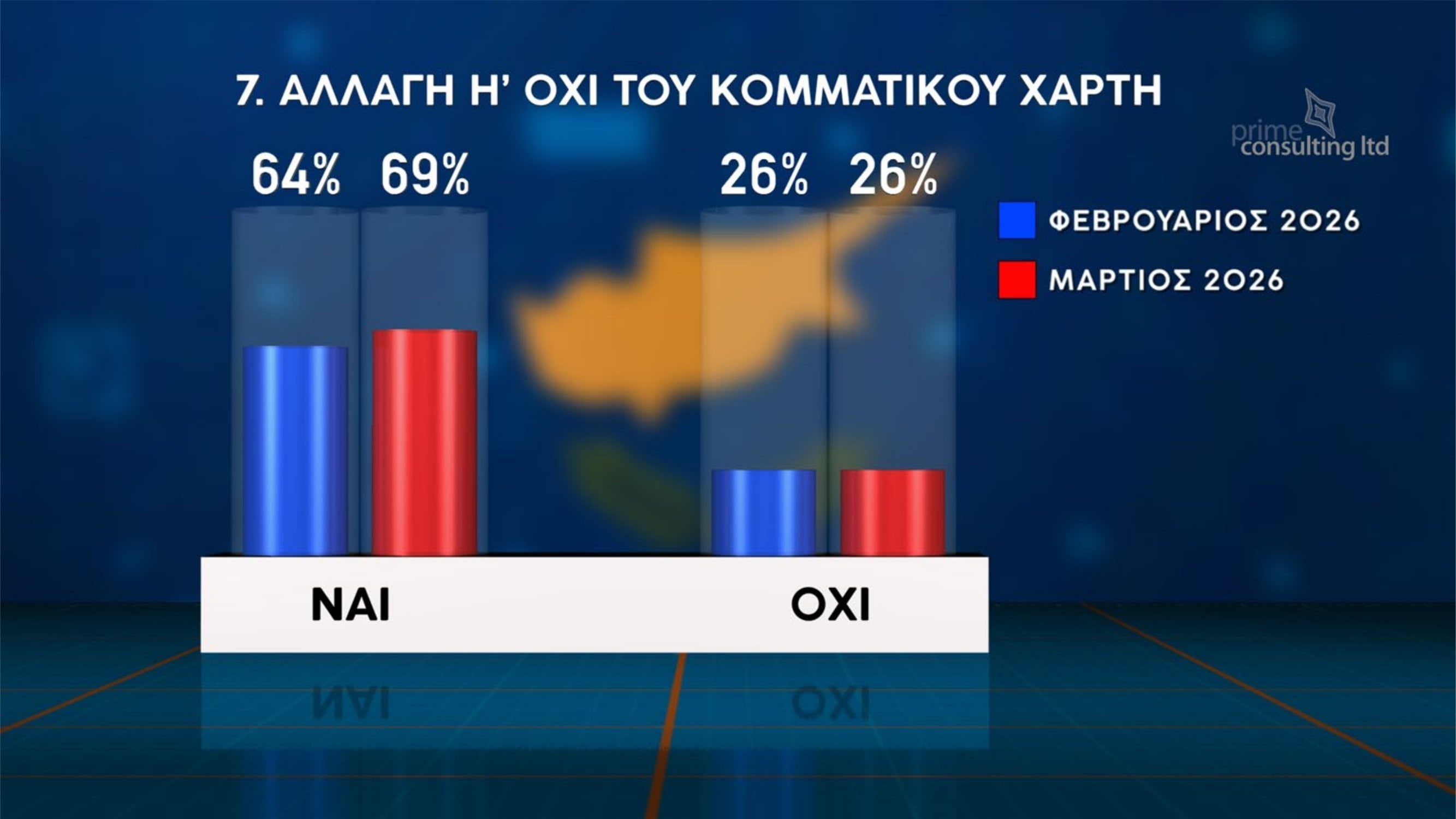 Παράλληλα, η πλειοψηφία των πολιτών εκφράζει την άποψη ότι χρειάζεται αλλαγή του κομματικού χάρτη. Συγκεκριμένα, το 69% θεωρεί ότι απαιτείται αλλαγή, ποσοστό αυξημένο σε σχέση με το 64% που καταγράφηκε τον Φεβρουάριο, ενώ το 26% εκτιμά ότι δεν χρειάζεται αλλαγή.