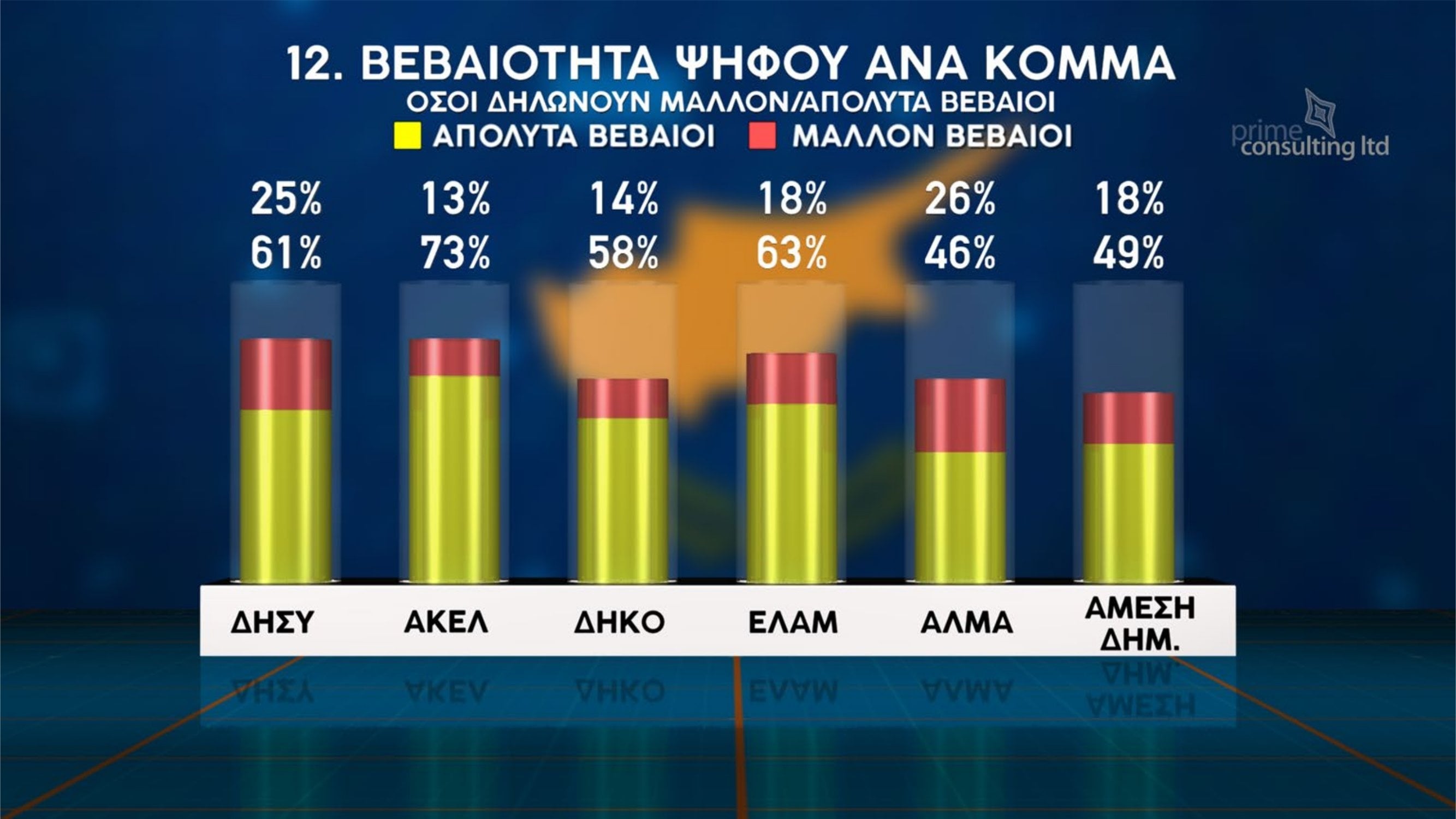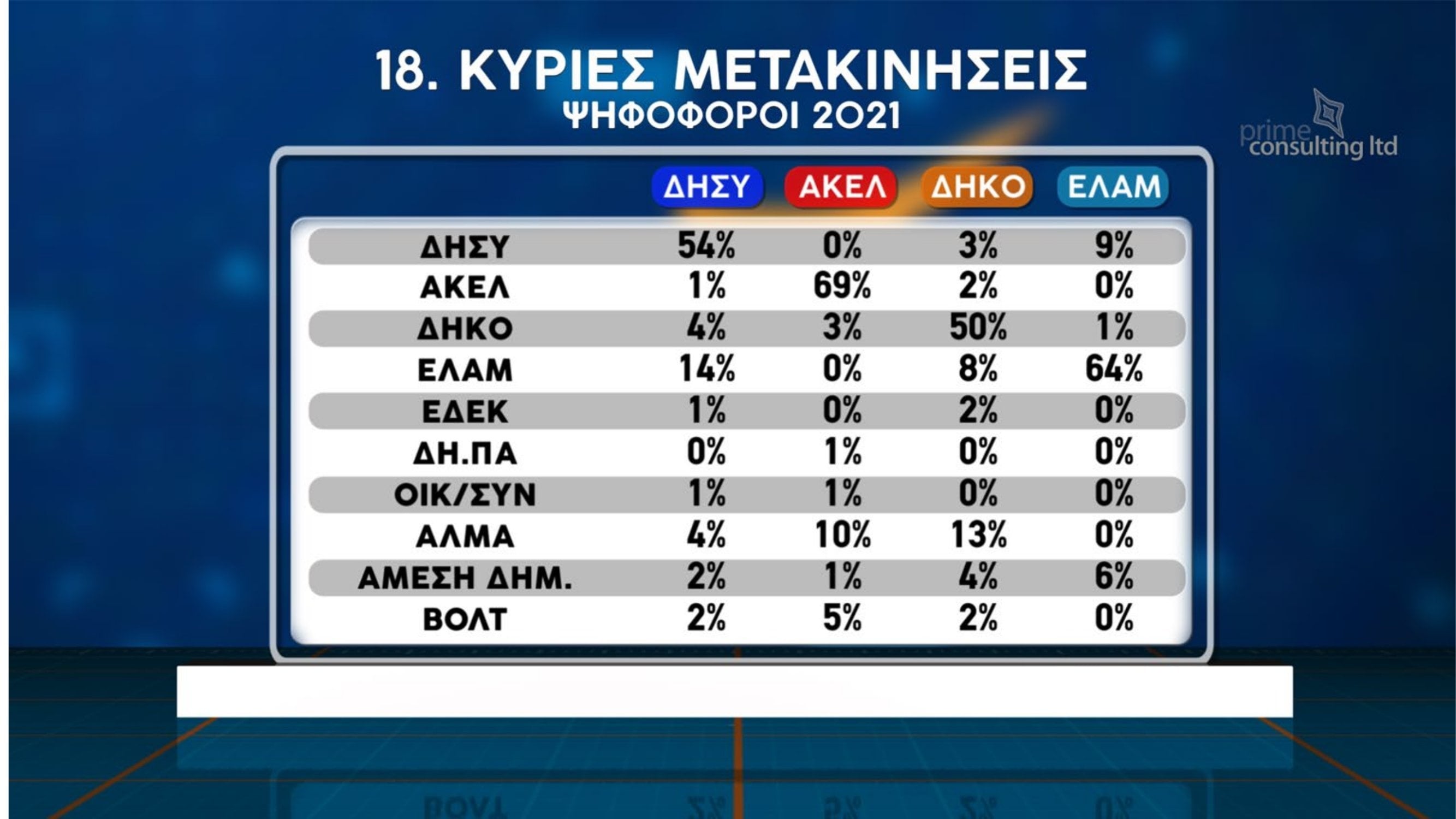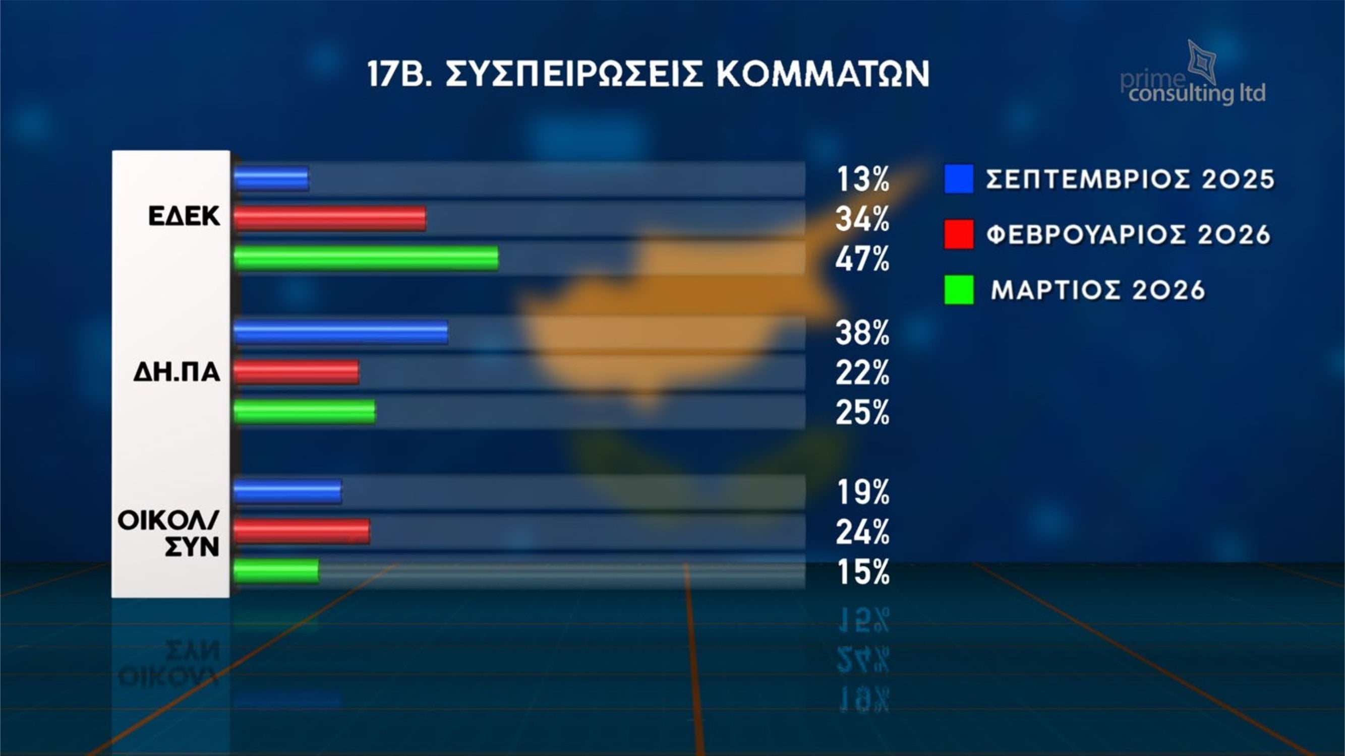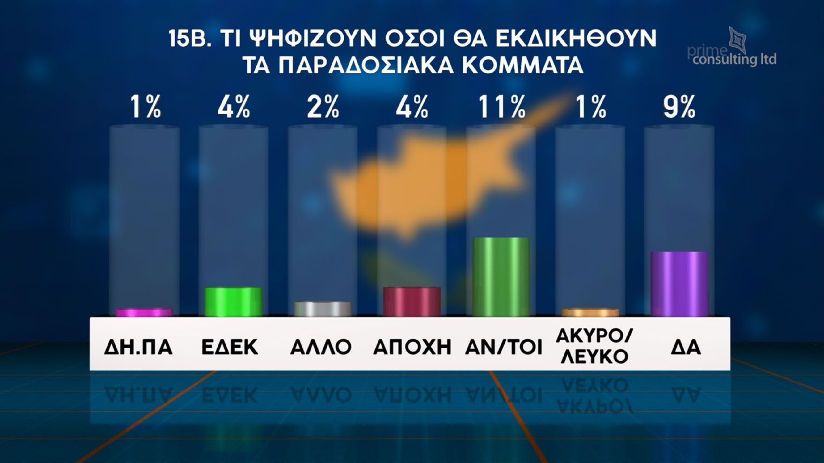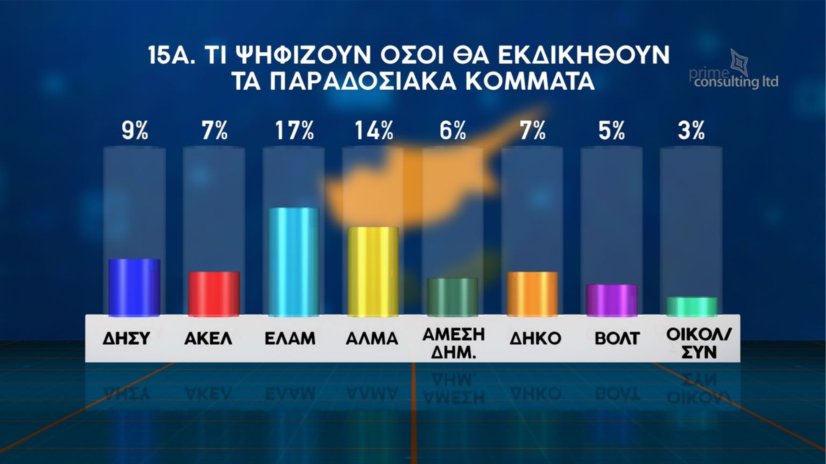 Σε ό,τι αφορά την πρόθεση ψήφου εάν οι βουλευτικές εκλογές διεξάγονταν την ερχόμενη Κυριακή, ΔΗΣΥ και ΑΚΕΛ εμφανίζονται να προηγούνται με 17% έκαστος. Ακολουθεί το ΕΛΑΜ με 11%, το ΑΛΜΑ με 9%, το ΔΗΚΟ με 7%, η ΑΜΕΣΗ Δημοκρατία με 5%, το ΒΟΛΤ με 3% και η ΕΔΕΚ με 2%.