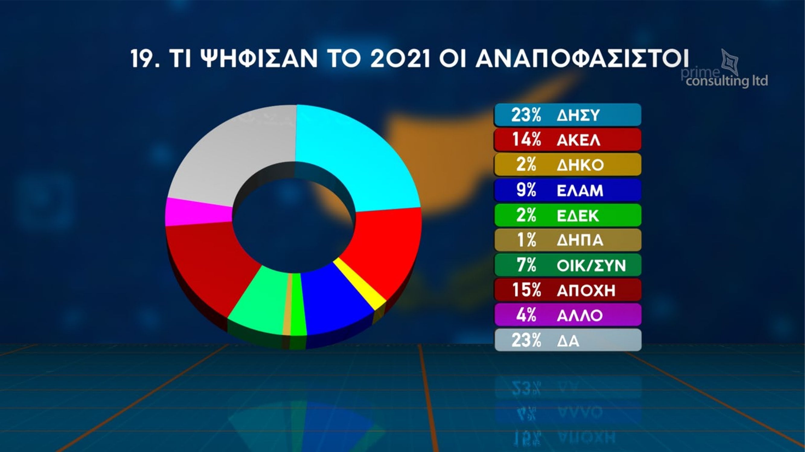 Στα έγκυρα ψηφοδέλτια τα ποσοστά διαφοροποιούνται ελαφρώς, με τον ΔΗΣΥ και το ΑΚΕΛ να καταγράφουν από 18%, το ΕΛΑΜ 12%, το ΑΛΜΑ 10%, το ΔΗΚΟ 7%, την ΑΜΕΣΗ Δημοκρατία 5%, το ΒΟΛΤ 3% και την ΕΔΕΚ 2%. Την ίδια στιγμή, το 13% των ερωτηθέντων δηλώνει αναποφάσιστο και ένα επιπλέον 8% δεν απαντά.
