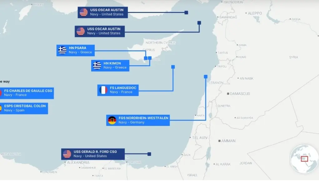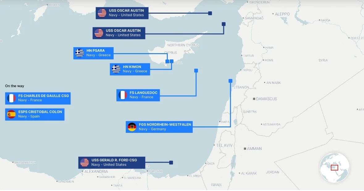 Τις τελευταίες ώρες, αρκετές ευρωπαϊκές ναυτικές μονάδες έχουν αναπτυχθεί στην Ανατολική Μεσόγειο για να συμβάλουν στην άμυνα της Κύπρου απέναντι στην αυξανόμενη απειλή που θέτουν ιρανικά drones και πύραυλοι. Γαλλικά και ελληνικά πολεμικά πλοία επιχειρούν πλέον γύρω από το νησί στο πλαίσιο μιας αμυντικής διάταξης, ενώ η γερμανική φρεγάτα FGS Nordrhein-Westfalen παραμένει ανοιχτά του Λιβάνου στο πλαίσιο της αποστολής UNIFIL. Την ίδια στιγμή, η αμερικανική δύναμη κρούσης αεροπλανοφόρου με επίκεντρο το USS Gerald R. Ford συμμετέχει ενεργά σε επιχειρήσεις κατά του Ιράν και στην άμυνα του Ισραήλ.