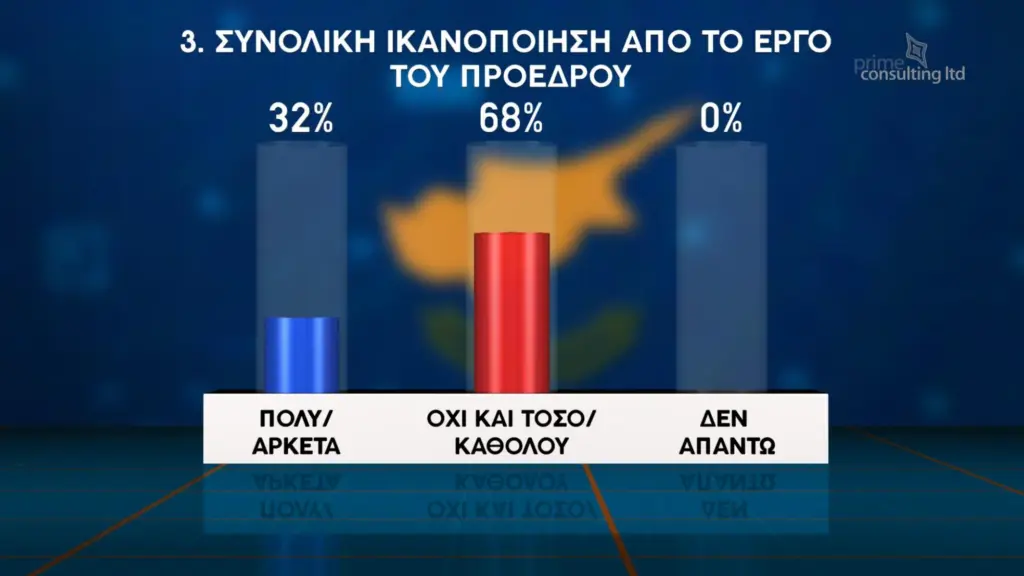 Ιδιαίτερα αρνητική είναι η αξιολόγηση του έργου του Προέδρου της Δημοκρατίας. Μόνο το 32% δηλώνει ότι είναι πολύ ή αρκετά ικανοποιημένο, ενώ το 68% απαντά «όχι και τόσο» ή «καθόλου». Μηδενικό καταγράφεται το ποσοστό όσων δεν απαντούν, στοιχείο που δείχνει ξεκάθαρη και διαμορφωμένη άποψη στην κοινωνία.