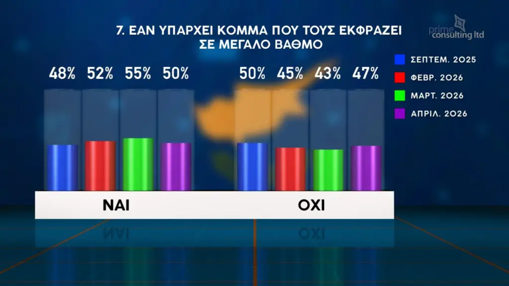 Στο κομματικό πεδίο, το 50% δηλώνει ότι υπάρχει κόμμα που το εκφράζει σε μεγάλο βαθμό, ενώ το 47% απαντά αρνητικά. Η εικόνα αυτή δείχνει μερική επανασυσπείρωση του κομματικού συστήματος σε σχέση με προηγούμενες μετρήσεις. Παράλληλα, το 43% θεωρεί τις εκλογές ευκαιρία για ψήφο διαμαρτυρίας, ενώ το 55% διαφωνεί.