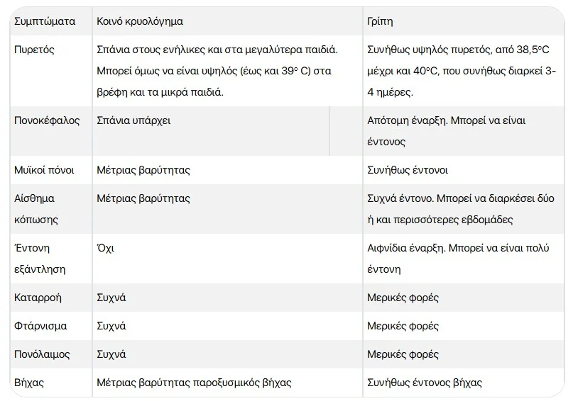 Στον παρακάτω πίνακα φαίνονται οι «κλασικές» διαφορές μεταξύ του κοινού κρυολογήματος και της γρίπης – παρότι τα συμπτώματα αυτά δεν εμφανίζονται πάντα.