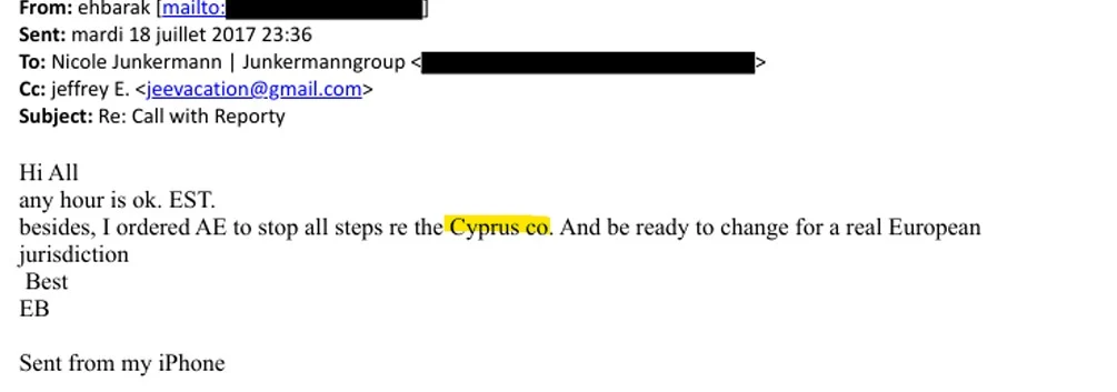 Ιδιαίτερο ενδιαφέρον παρουσιάζει e-mail του 2017, στο οποίο γίνεται λόγος για χρήση της Κύπρου ως εταιρικής έδρας, με τη φράση ότι το «ισραηλινό κόλπο χρήσης της Κύπρου για αποφυγή φόρων είναι παρωχημένο και επικίνδυνο». H αλληλογραφία δείχνει να είναι μεταξύ του πρωην ισρηλινού Πρωθυπουργού Εχούντ Μπάρακ και του Έπστιν και ενός άλλους προσώπου. Σε συνέχεια της αλληλογραφίας καταγράφεται εντολή για πάγωμα διαδικασιών που αφορούν κυπριακή εταιρεία και αναζήτηση «πραγματικής ευρωπαϊκής δικαιοδοσίας»