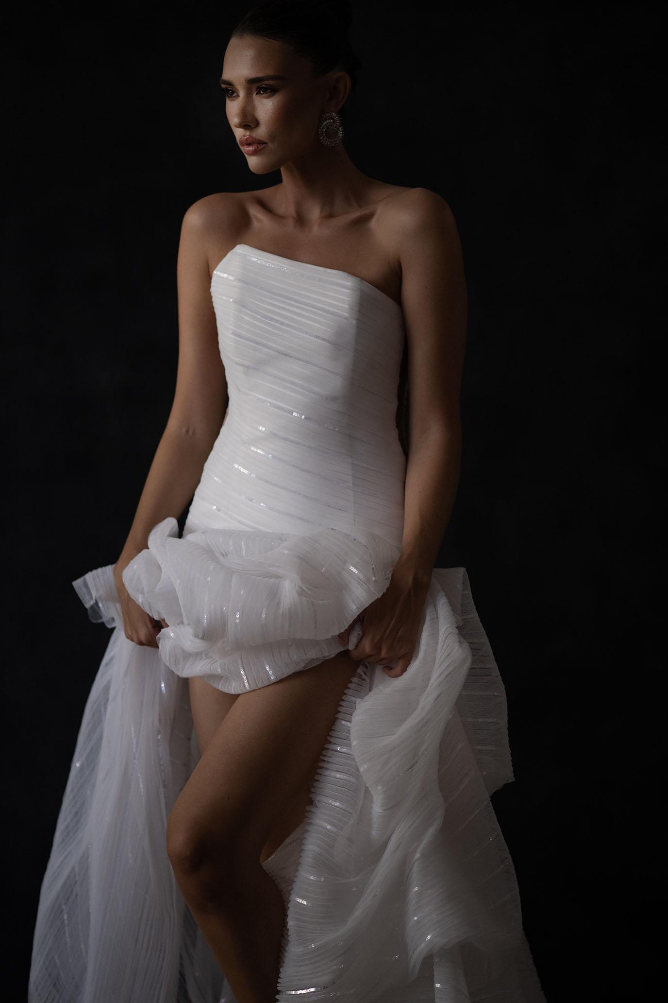 Μίνι νυφικά με αποσπώμενες κάπες που λειτουργούν ως statement μετατρέπονται με μια κίνηση στα πιο εντυπωσιακά party dresses.