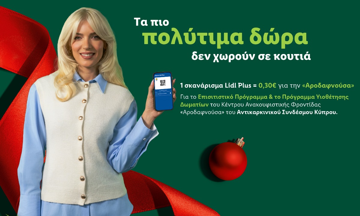 Συνεχίζοντας την επιτυχημένη συνεργασία των προηγούμενων ετών, φέτος, από τις 5 Δεκεμβρίου έως και τις 21 Δεκεμβρίου 2025, η Lidl Κύπρου θα προσφέρει €0,30 με κάθε σκανάρισμα της κάρτας Lidl Plus στα ταμεία των καταστημάτων της. Το ποσό αυτό θα διατεθεί για την ενίσχυση του Επισιτιστικού Προγράμματος και του Προγράμματος Υιοθέτησης Δωματίων του Κέντρου «Αροδαφνούσα».
