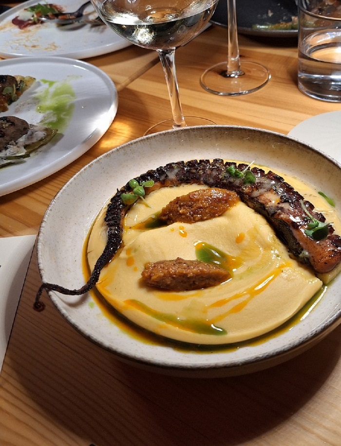 Ακολούθησαν οι πληθωρικοί κεφτέδες στα κάρβουνα πάνω σε λαδόπιτα, με πρόβειο γιαούρτι chutney ψητής ντομάτας και φασολάκια στα κάρβουνα, και το χταπόδι στα κάρβουνα με chutney λουκάνικο chorizo και λεμονάτη φάβα, ένα πιάτο γενναιόδωρης νοστιμιάς.