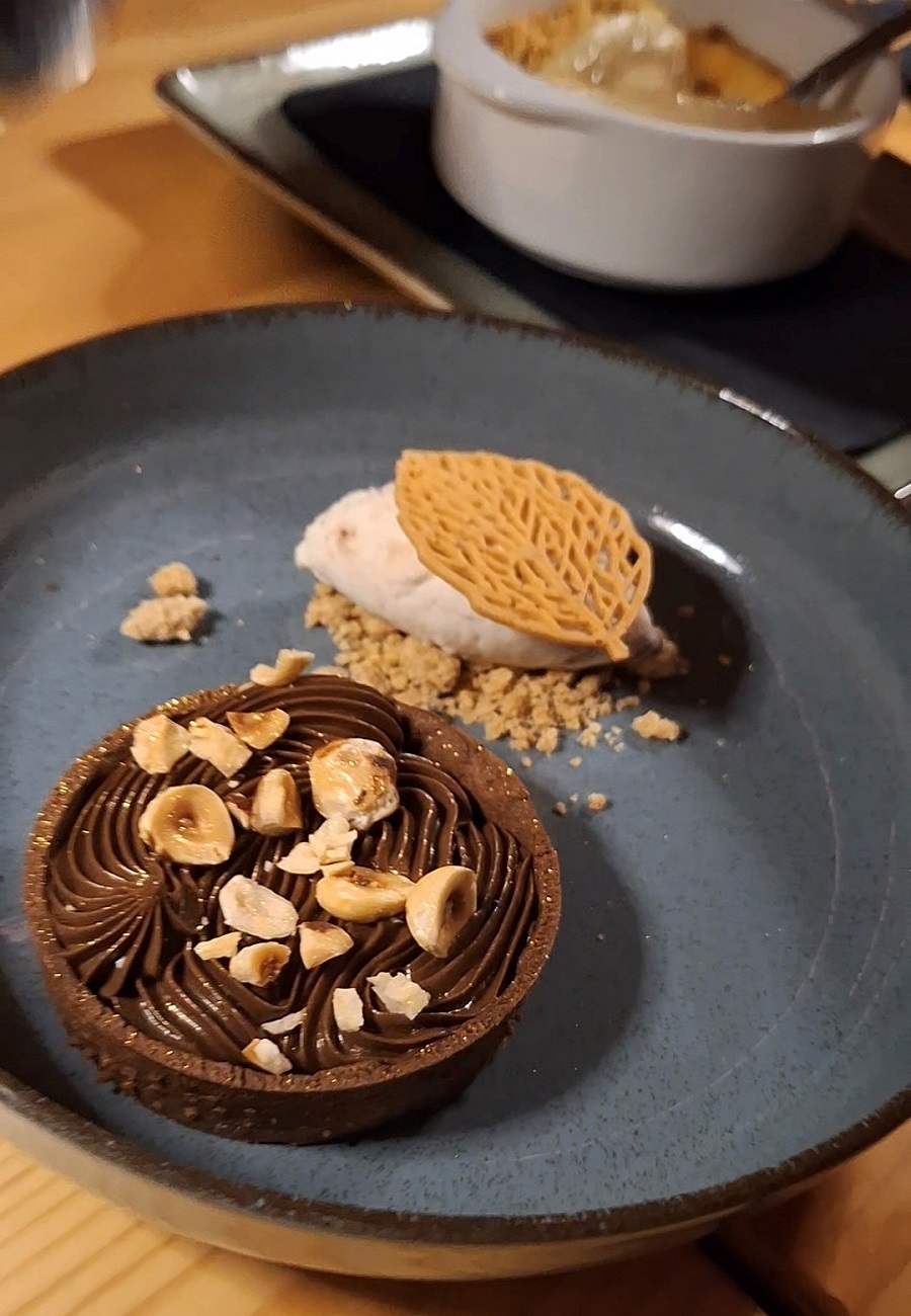 Η γαστρονομική πανδαισία γεύσεων ολοκληρώθηκε με την ταχινόπιτα με παγωτό αλμυρής καραμέλας, την απλή -αλλά γευστικότατη- γαλατόπιτα με αχλάδι ποσέ και crumble φιστίκι αιγίνης, και την θεϊκή τάρτα σοκολάτας με παγωτό φουντούκι.