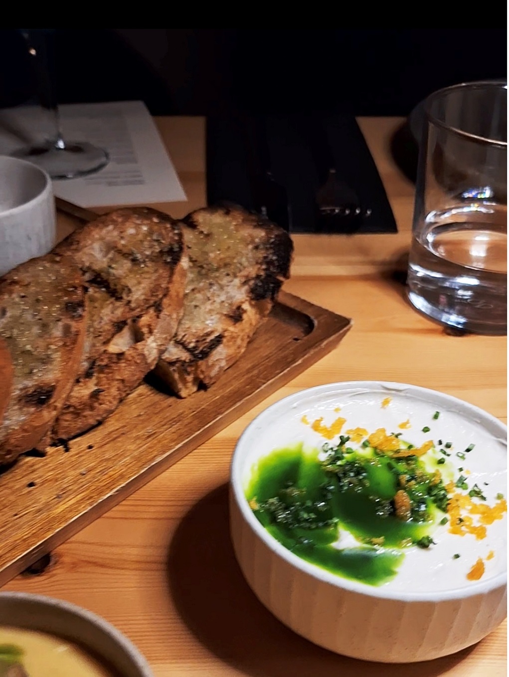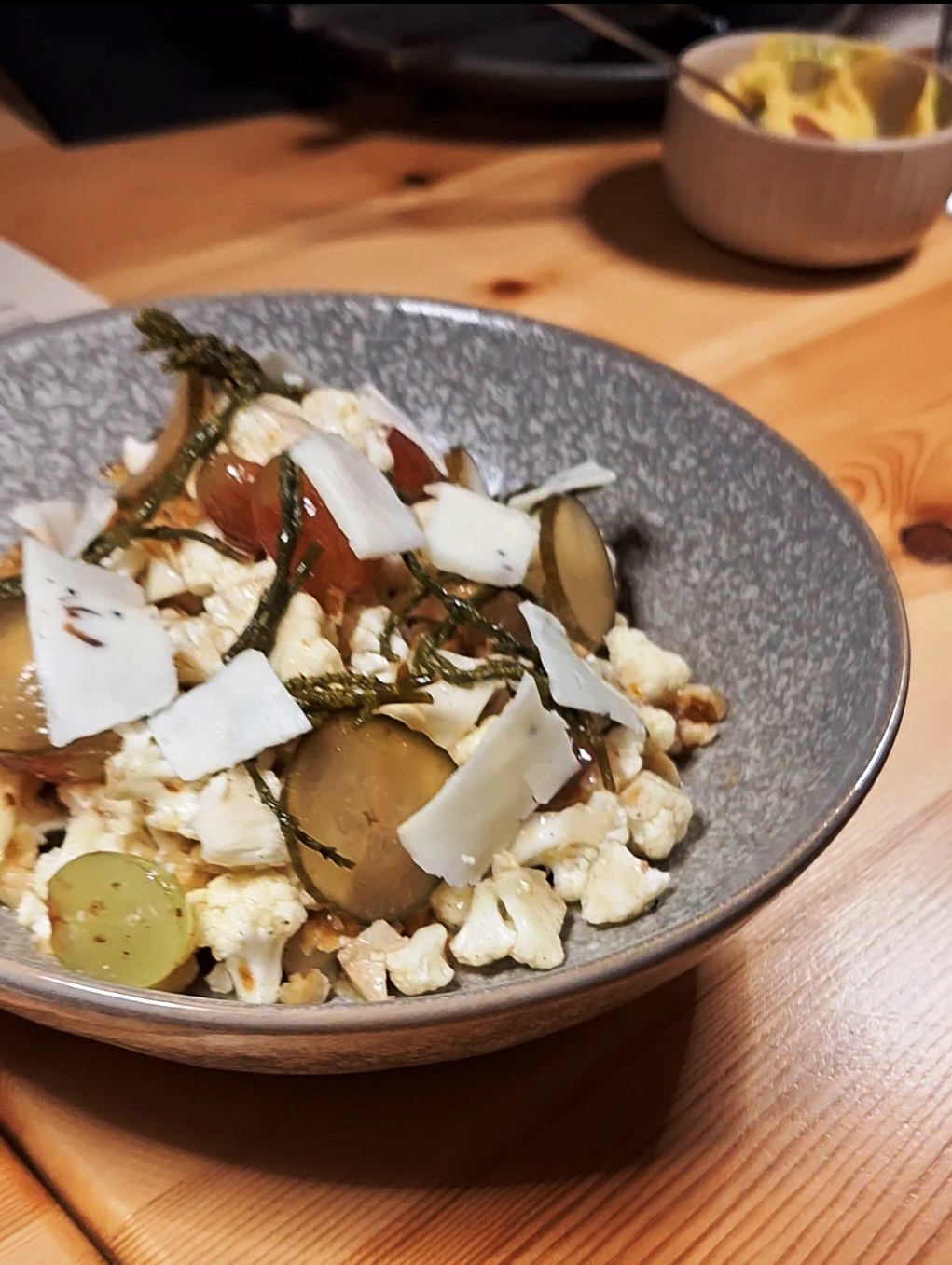 Σε ένα τέτοιο γαστρονομικό ταξίδι βρεθήκαμε. Η αρχή έγινε με προζυμένιο ψωμί με ελαιόλαδο συνοδευόμενο από ανθό αλατιού, φάβα με πίκλα κρεμμυδιού και καπνιστό ταραμά με πούδρα αυγοτάραχου. Συνεχίσαμε με σαλάτες. Δοκιμάσαμε τη δροσερή σαλάτα Panzanella με χοντροκατσαρές ντομάτες, κατσικίσιο τυρί, ξιδάτη σαρδέλα, αρκατένο παξιμάδι και φρέσκο θυμάρι. Η δεύτερη σαλάτα με ωμό κουνουπίδι, σταφύλια καρύδια, πίικλα από αγγούρι και πεκορίνο τρούφας, ήταν ομολογουμένως μια από τις εκπλήξεις της βραδιάς.