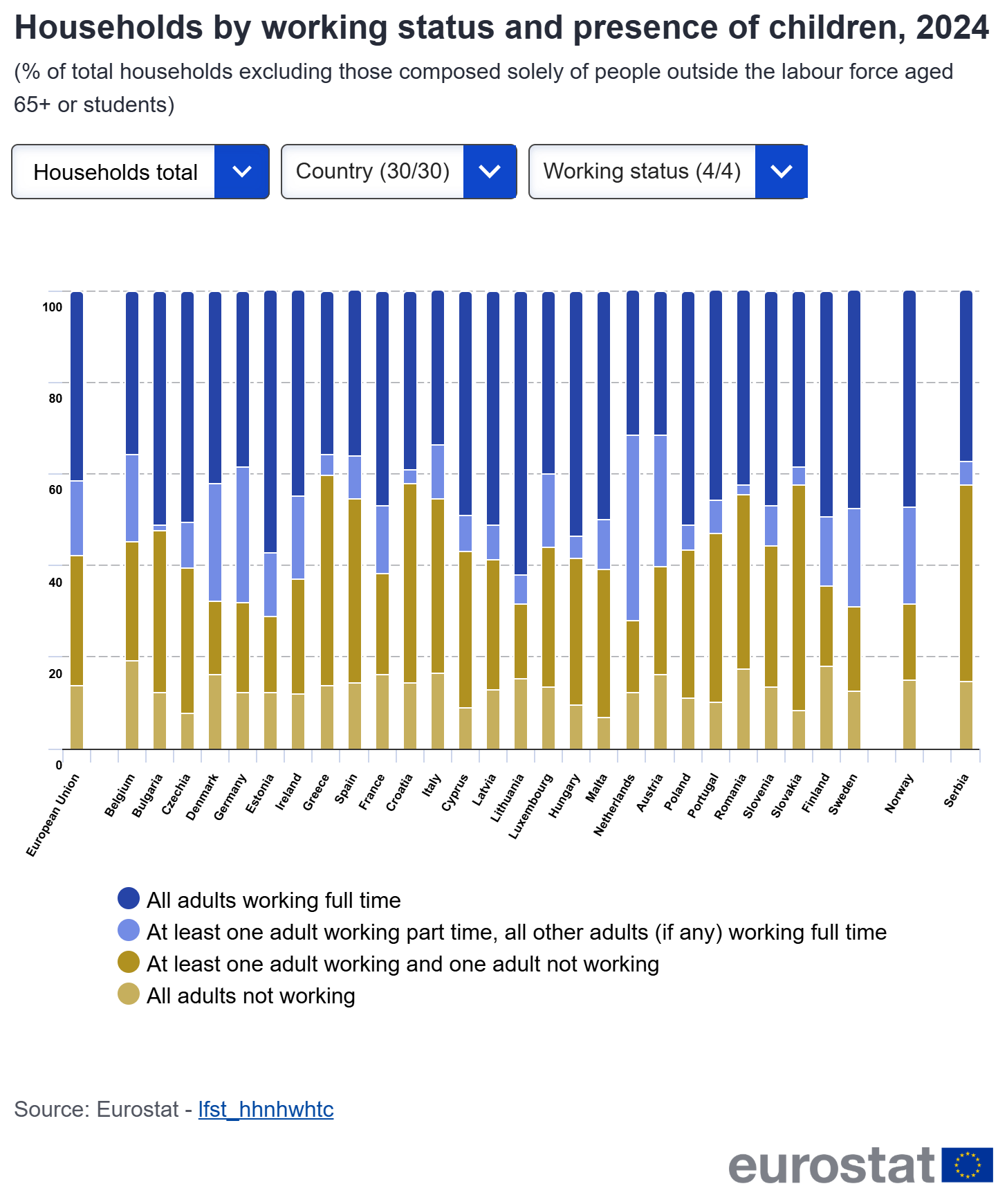 Η εικόνα αυτή έρχεται σε πλήρη αντίθεση με την Ελλάδα, όπου το ποσοστό των νοικοκυριών με όλους τους ενήλικες σε πλήρη απασχόληση περιορίζεται στο 35,6%, ενώ το 46% των νοικοκυριών περιλαμβάνει τουλάχιστον έναν εργαζόμενο και έναν ενήλικα που δεν εργάζεται.
