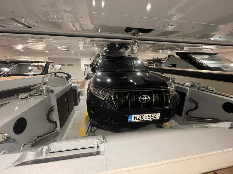 Ιδιαίτερο ενδιαφέρον παρουσιάζει ο εξοπλισμός του σκάφους. Το γκαράζ του περιλαμβάνει μεγάλο αριθμό βοηθητικών σκαφών και οχημάτων, όπως ταχύπλοα, jet ski και τετράτροχες μηχανές (τις επονομαζόμενες γουρούνες) ενώ υπάρχει και hovercraft ικανό να κινείται σε στεριά και νερό. Επιπλέον, το σκάφος διαθέτει ένα μικρό υποβρύχιο τύπου Triton, ενώ έχει και γκαράζ για αυτοκίνητα τύπου SUV τα οποία πιθανόν χρησιμοποιούνται από τα μέλη της ασφάλειας του Ρώσου Ολιγάρχη.