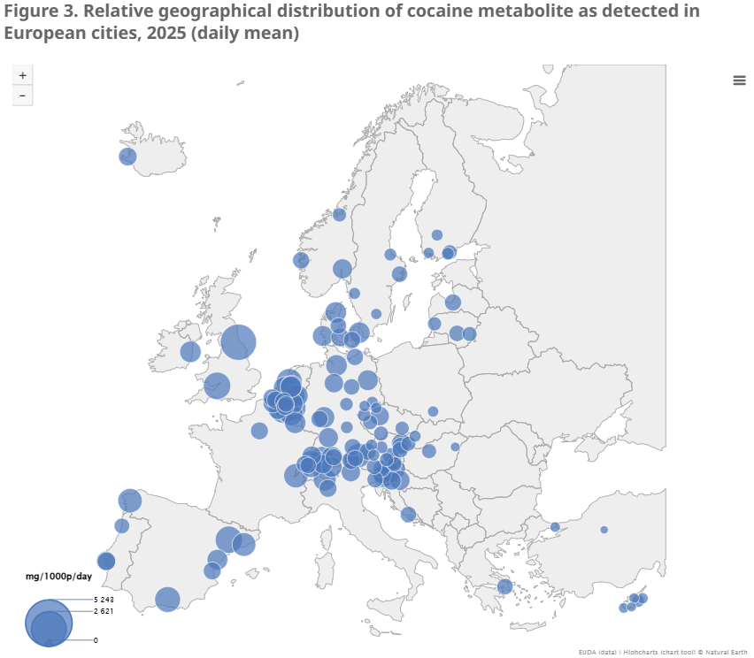 Η πιο καθαρή τάση του 2025 αφορά την κοκαΐνη. Σε σχέση με το 2024, το φορτίο του βασικού μεταβολίτη της στα λύματα αυξήθηκε συνολικά κατά 22%, επιβεβαιώνοντας ότι η ουσία παραμένει ισχυρά παρούσα κυρίως στη δυτική και νότια Ευρώπη. Οι υψηλότερες συγκεντρώσεις εντοπίστηκαν σε πόλεις του Βελγίου, της Ολλανδίας και της Ισπανίας, ενώ χαμηλότερα επίπεδα καταγράφηκαν στις περισσότερες πόλεις της ανατολικής Ευρώπης (αν και εμφανίζονται ενδείξεις ανόδου).