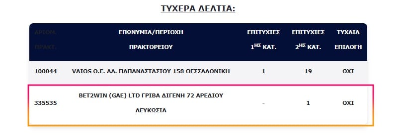 Επίσης, είκοσι (20) τυχερά δελτία βρέθηκαν στη 2η κατηγορία (5), τα οποία κερδίζουν το ποσό των €100.000,00 για κάθε επιτυχία. Το ένα από αυτά παίχτηκε στο Αρεδιού, στην επαρχία Λευκωσίας.