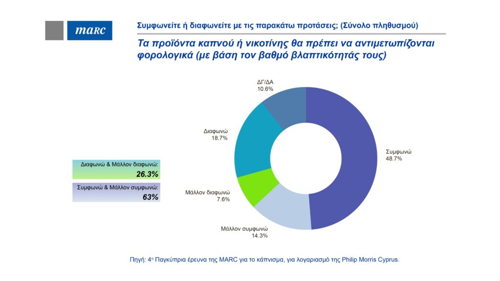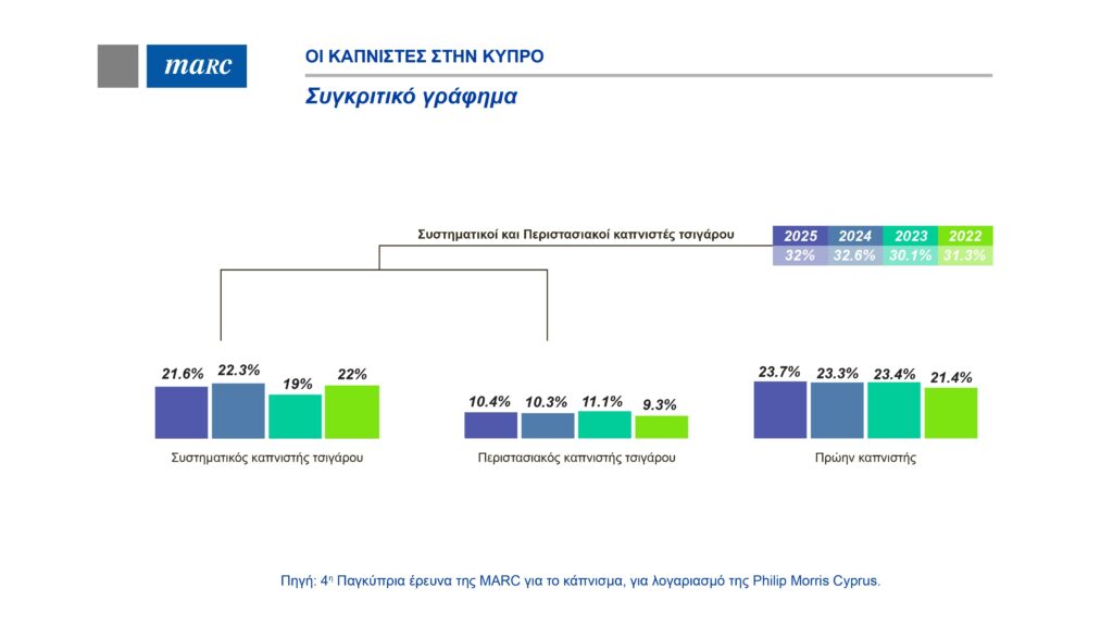 Σύμφωνα με την έρευνα, 3 στους 10 Κύπριους, (32%) εξακολουθούν να καπνίζουν. Ένα πολύ σημαντικό ποσοστό των καπνιστών, (76,6%) δηλώνει ότι δεν έχει επαρκή πληροφόρηση για τα εναλλακτικά, του καπνίσματος τσιγάρου, προϊόντα. Η ανάγκη για τεκμηριωμένη ενημέρωση εξακολουθεί να αποτελεί το κεντρικό ζητούμενο, καθώς 8 στους 10, (84%) θεωρούν ότι η επιστήμη και η τεχνολογία θα πρέπει να λαμβάνεται σοβαρά υπόψη στην επιλογή του σωστού εναλλακτικού προϊόντος. Την ίδια στιγμή, 6 στους 10 ερωτηθέντες, (63%) πιστεύουν ότι τα προϊόντα καπνού και νικοτίνης θα πρέπει να φορολογούνται ανάλογα με τον βαθμό βλαπτικότητάς τους, υποδεικνύοντας την ανάγκη για μια πιο ορθολογική και δίκαιη προσέγγιση πολιτικής υγείας.