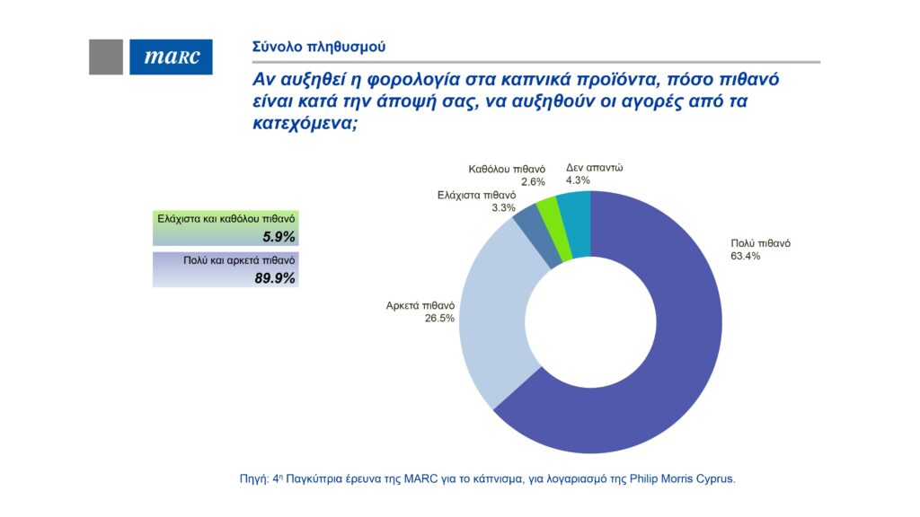 Συγκεκριμένα, σχεδόν 7 στους 10 (65,5%) ερωτηθέντες πιστεύουν ότι δεν ασκείται αποτελεσματικός έλεγχος για την καταπολέμηση της παράνομης εισαγωγής τσιγάρων ή εναλλακτικών καπνικών προϊόντων από τα κατεχόμενα. Εξίσου σημαντικό, είναι το γεγονός ότι σχεδόν 9 στους 10 ερωτηθέντες (89,9%) εκτιμούν ότι πιθανή αύξηση της φορολογίας στα καπνικά προϊόντα θα οδηγούσε σε αύξηση των αγορών από τα κατεχόμενα.