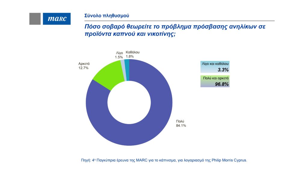 Το ζήτημα της πρόσβασης των ανηλίκων σε προϊόντα καπνού και νικοτίνης αναδεικνύεται και φέτος ως ένα από τα πιο ανησυχητικά ευρήματα της έρευνας. Σχεδόν το σύνολο των ερωτηθέντων (96,8%) θεωρούν το πρόβλημα πολύ έως αρκετά σοβαρό, ενώ το 93,1% πιστεύει ότι η αγορά και η προμήθεια προϊόντων καπνού και νικοτίνης από ανήλικους είναι εύκολη.