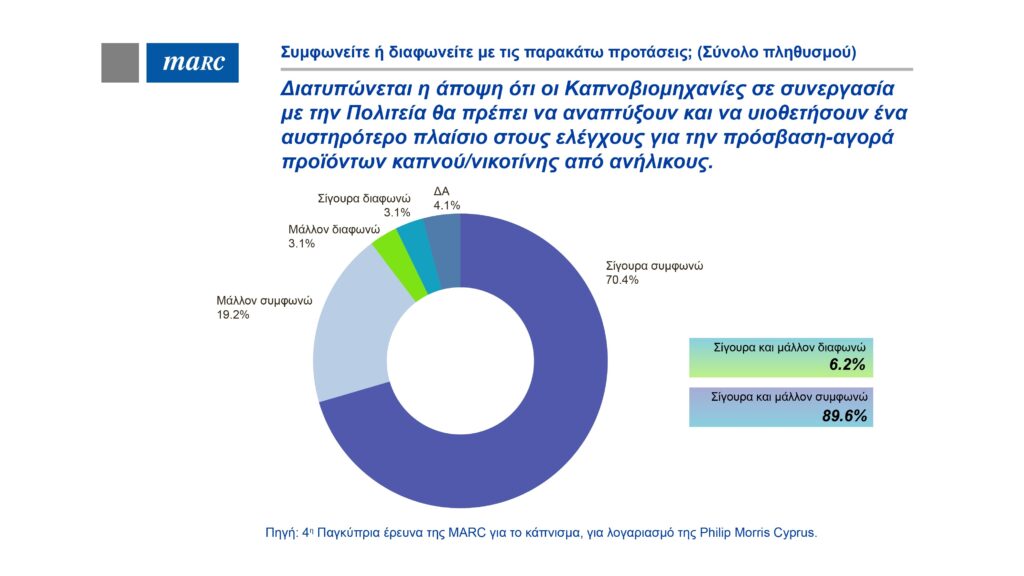 Ταυτόχρονα ένα 89.6% ή σχεδόν 9 στους 10 ερωτηθέντες θεωρούν ότι οι καπνοβιομηχανίες θα πρέπει να συνεργασθούν με την πολιτεία για να αναπτύξουν και να υιοθετήσουν ένα αυστηρότερο πλαίσιο στους ελέγχους για την πρόσβαση των ανηλίκων σε προϊόντα καπνού και νικοτίνης.
