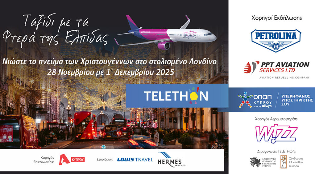 Με κύριους χορηγούς την PETROLINA και τη συνδεδεμένη της εταιρεία PPT Aviation Services Ltd, και με επίσημο αερομεταφορέα τη Wizz Air, το «Ταξίδι με τα Φτερά της Ελπίδας» συνδυάζει, μια ολιγοήμερη γιορτινή εκδρομή στο στολισμένο Λονδίνο με μια πράξη αγάπης και αλληλεγγύης. Μέρος των εσόδων θα διατεθεί στο TELETHON, ενισχύοντας με αυτό τον τρόπο το έργο του Ινστιτούτου Νευρολογίας και Γενετικής Κύπρου και του Συνδέσμου Μυοπαθών Κύπρου.