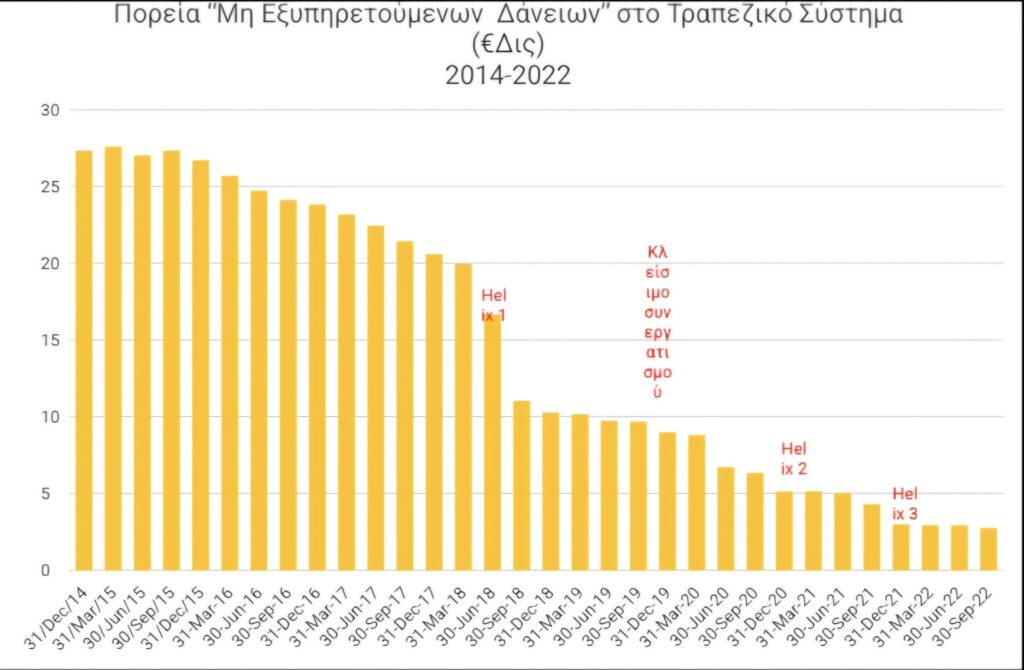 Επισημαίνουμε ότι από την μείωση των προβληματικών δάνειων κατά €24,6 δισ. στην περίοδο 31-Δεκ-14 έως στις 30-Σεμπ-22, €5,6 δισ. οφείλεται στο κλείσιμο του Συνεργατισμού, και €7 δις στην πώληση προβληματικών δανείων από την Τράπεζα Κύπρου σε μη-τραπεζικές εταιρίες διαχείρισης προβληματικών δανείων (Helix 1,2,&3). Δηλαδή πέραν της μισής μείωσης ήταν το αποτέλεσμα της ανάληψης προβληματικών δανείων από οργανισμούς εκτός του τραπεζικού τομέα με πολύ ψηλά ποσοστά από αυτά να εξακολουθούν να είναι προβληματικά [8].